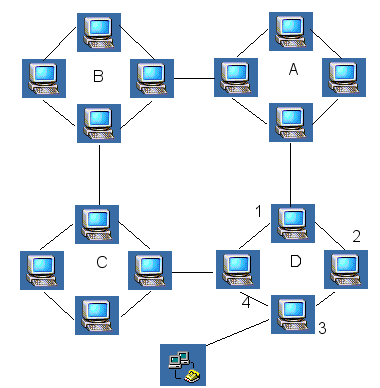 In fig.1 è rappresentato un collegamento tra 4 reti denominate A, B, C e D e la modalità secondo cui un utente privato remoto può accedere alle risorse di qualsiasi computer di qualsiasi rete disponendo di un modem e di un permesso di accesso al nodo 3 della rete D tramite linea telefonica, di solito commutata. Internet utilizza i gateway o router (instradatore) con la funzione di collegamento tra più reti.