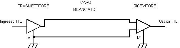 L'uscita del trasmettitore è a livello logico 1 (mark) se la differenza di potenziale tra l'uscita non invertente e quella invertente è negativa e compresa tra -6V e -2V; è al livello logico 0 (space) se tale d.d.p. è positiva e compresa tra 2V e 6V. L'impedenza di uscita del trasmettitore deve essere inferiore a 100 e la corrente di uscita di cortocircuito non deve superare il valore di 150mA. M e M' sono, rispettivamente, la massa del trasmettitore e del ricevitore; tra loro è presente una d.d.p. vm.