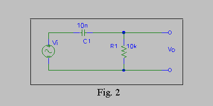 Il circuito e' costituito da pochi componenti, e cioe' da una resistenza di valore R=10Kohm, una capacita' di valore C=10nF e infine da un generatore di onde sinusoidali. Come si puo' osservare, a differenza del circuito passa-basso, l'uscita viene prelevata, questa volta, ai capi della resistenza R1.