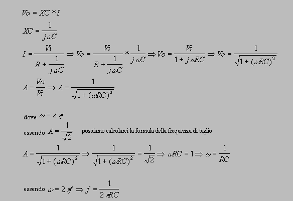 Una volta ricavata la formula della frequenza di taglio, grazie al metodo teorico, andiamo a sostituire nella formula i valori riportati nel circuito in questione ottenendo una ft = 1,59Khz. Anche la fase della tensione di uscita, come detto prima, risultera' legata alla frequenza, infatti: