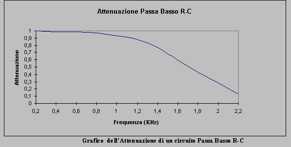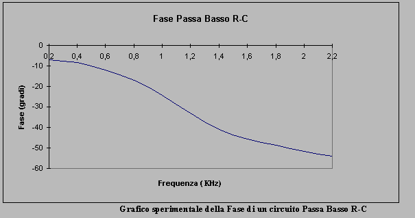 Qui sono rappresentati rispettivamente i grafici della fase e dell'attenuazione di un circuito passo-basso. Il grafico della fase risalta maggiormente il principio di funzionamento in quanto si nota per via grafica, questa volta, che alla frequenza di 1,6KHz, frequenza di taglio, la fase e' uguale a -45°.