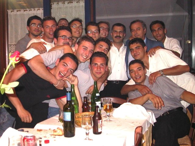 Foto di gruppo durante la cena di fine anno organizzata dagli studenti della 5D del 2000.