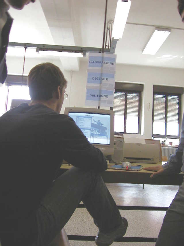 Gruppo di studenti che hanno seguito il corso dell'elaborazione digitale dell'audio impegnati durante la mostra dell'area di progetto.