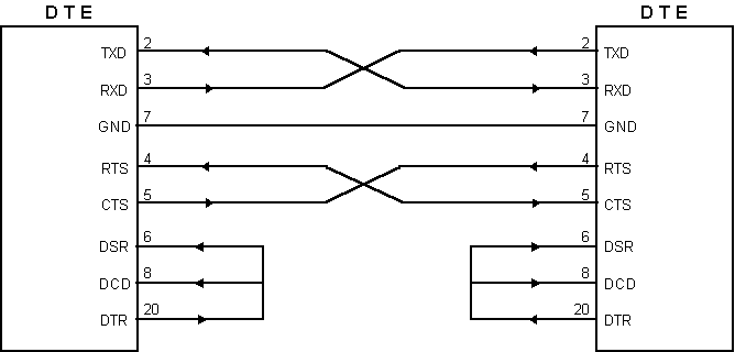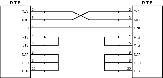 Per collegare tra di loro due computer con l'interfaccia seriale RS-232 si deve preparare un cavo, noto come cavo null modem, con almeno tre fili (RxD, TxD e GND) e due connettori a 25 poli femmine da porre alle due estremità del cavo. Occorre, però, fornire i corretti potenziali alle linee di ingresso che non si intendono utilizzare.